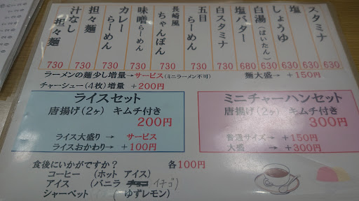 Read moreたまたま通りかかってランチで寄せてもらいました。 ラーメン専門店では無くて街中華のお店って感じです。 駐車場は見せの周りに7台数ほど。 軽自動車専用が半分ぐらい。 正直辺鄙な場所なのですが、あっという間に車が満車になるのに驚きました。 席は座敷が1席、2人席が5個ほど? 近所のご家族、ご夫婦、工事業者さん、営業さんって感じの客層です。 セットメニューも豊富で色々組み合わせが出来るのが人気の秘密かも。 スタミナとミニ天津飯を頼みました。 スタミナは彩︎華ラーメンと神座の間ぐらいの味、天津飯は王将っぽい? メニューには何故かオムライスセットもあってビックリしましたが営業っぽいお客さん二人とも頼んでいたので美味しいのかも?セットメニューのトップにしてるぐらいなので1番人気? 今度は白スタミナラーメン試してみたいですね。 焼きそば定食があるのは関...