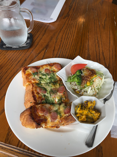 ピザトーストを注文🍕 焼きたてでチーズがよく伸びる☺️ パン生地もフワフワでとても好き🍞 カボチャサラダはレーズン入ってる🥳 サラダのドレッシングが美味しかった♩和ドレっぽかったかな🤔訊いてみれば良かった