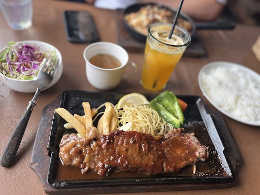 Read moreメニューの数が多いカントリーレストラン。 私はログステーキ1,400円を注文。ライス、サラダ、スープ、ドリンクがセット。ライスの量を聞かれ普通で頼んだが、小で普通量くらいなので次からは小にしようと思った。(確か前回も反省した)ステーキはアメリカンな少しかみごたえのある美味いやつ。ソースも好きな味。お値段にしては量も多くお腹いっぱい大満足。 友人が頼んだステーキドリアも、大盛りにしたら本当に大盛りでびびっていた。 鹿屋体大の近くだから、鹿屋体大向けのサイズなのかもしれない。 他のお客さんが頼んでた唐揚げやハンバーグもおいしそうだったので次は頼んでみたい。