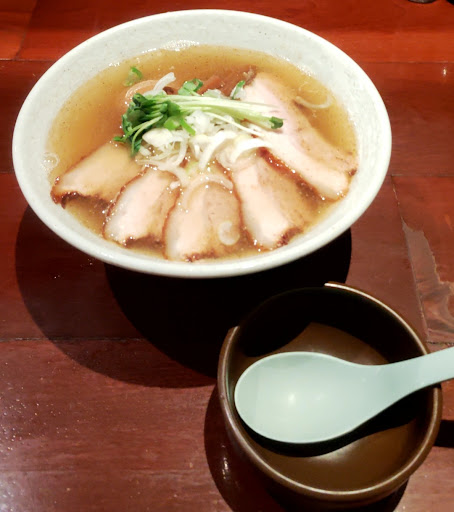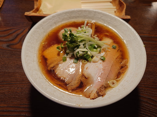 以前は和食系のお店でしたよね その雰囲気を残してオープンして年月を重ねてきたお店 スタッフさんの無駄な会話のない厨房が見ていて気持ちがいいですね 訪問した日は魚介だしのスープの日でした 日曜日から木曜日は丸鶏ベースのスープ 金曜日土曜日は魚介だしのスープで提供される仕組みなんですね 今回はお魚あっさりラーメン肉増しと餃子をオーダー 出て来たラーメンはその瞬間に節系の香りが鼻腔に充満して食欲が増し増しです 魚粉と思われるものも振りかけてあり、まさにお魚ラーメンですね トッピングの肉があっさりしたスープのアクセントになっています 細麺にスープがよく絡み魚介だしを堪能できました 次に出て来た餃子は水餃子のような茹でられた餃子でした 餡は甘味があり茹ですぎてないので野菜の食感もあり皮のもっちり感とのギャップがなんとも言えません そのまま食べても餃子の味を楽しめますが辛味噌が付いてくるので刺激のある味も楽しめます この餃子は冷める前に召し上がることをおすすめします 次は鶏ベースのラーメンが食べたいですね 美味しいラーメンごちそうさまでした