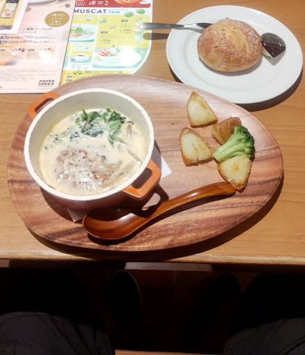 久しぶりのCOCO'Sさん ドリンクバーのコーヒーサーバーが新しくなってました カフェインレスのコーヒーも飲めますね 今後も利用するのが楽しみですね 今回はアスパラガスとカマンベールのトマトクリームココットハンバーグをオーダー とろけたカマンベールチーズとアスパラガスの食感やソースをからめたバケットがたまらないです トマトの酸味よりクリームの濃厚さが強めになっています もちろんハンバーグもいつものCOCO'Sさんの味わいを楽しめました 濃厚なクリームソースが口の中に充満します そんな時のエスプレッソコーヒーは劇的に口の中をすっきり感満載にしてくれますね 月替わりのメニューなので今だけメニューですよ(230407)