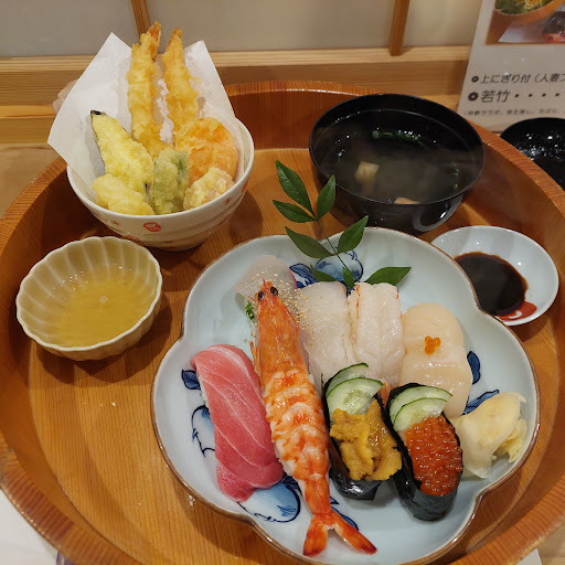 若竹(3.700)を注文、茶碗蒸しは食べてる間にできあがるのでできたてを食べれて味も優しい味で(初めての経験でした)、アツアツなので火傷に気をつけて😋天ぷらも揚げたてでサクサクで衣に風味もあり美味しかった♪︎柿酢サラダも美味しい!(よくまぜて食べてねって言われます) お吸い物、お寿司🍣は普通に美味しい😊 プリンもバニラとカスタードで選ばせてくれます😃 どちらも美味しい😋🍴💕 巻き寿司と人妻プリンは味がたくさんあってテイクアウトもできるそうで、暖房があたらないトランクにいれてねって言われてました😂 魚のアラ無料でもらえるみたいで必要な方はジップロックの袋とか持っていくといいかも? カウンターか相席、個室がよい方は予約がおすすめでメニュー決めてると早く提供されるみたいですよ☺ 接客も近所のおばちゃん感...
