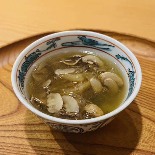 ・フカヒレとアスパラの上湯マッシュルームスープ 佐賀の地酒「万齢 特別純米酒 超辛口」との相性が抜群。