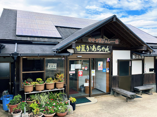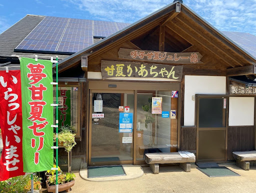 Read more加部島の風の見える丘公園から奥(北向き?)に農道を下る途中にあります。小さなお店ですが周りに建物が無いので判ると思います。基本直売所という感じで、店内で飲食する作りではありませんでした。テーブル席が1つありますが、試食のゼリー(買い物をする前から出してくれましたw)を食べる所と言う感じです。当然甘夏ソフトやパフェはありません(^▽^;) 頂いた試食のゼリーと買った甘夏アイスをその場でいただきましたが、無農薬の甘夏を使ったというゼリーは甘酸っぱく爽やかでプルプルした食感が素晴らしく、アイスはバニラアイスに甘夏の粒粒が入った様な不思議でさっぱりした味(口に入れるとバニラアイスの味がしてから甘夏のかすかな苦みと甘酸っぱさが来る感じ)で美味しかったですよ♬(写真はお土産の夏みかんゼリーと...