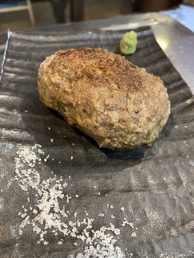 佐賀は言わずと知れた名ブランド「佐賀牛」そして「伊万里牛」のお膝下。だが、折角のご当地で頂こうとすると、古典的な鉄板焼きスタイルが多い。それはそれで良いのだが、もっと気楽にサッと食べたい時もある。 佐賀・唐津にこういうスタイルの店が出てきてくれていることは、大変喜ばしい。 この日はハンバーグとステーキの相盛りのセットを頼んだが、テーブルにつき、写真付きメニューブックを見ながら注文を済ませると、テンポよくまずはスープ、少しして厨房から小気味良いジュージューという音ともに、肉が運ばれてくる。 外はこんがり中は生に近い状態で運ばれてくるハンバーグは、焼き石で自分好みに焼く方法で、楽しい。個人的にはそのままほぼ生で食べるのが好きだ。