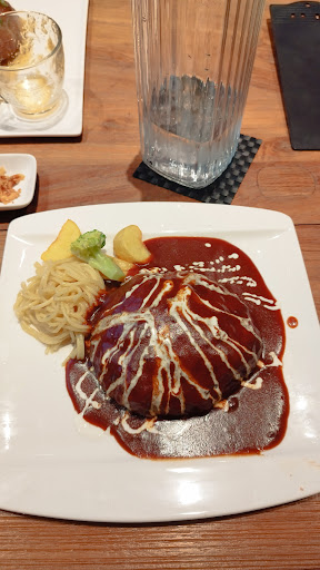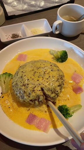 階段を降り、お一人様はカウンターに メニューと共にQRコードを渡される ここから、ログインしてオーダーが出来る オープンして1年位らしいお店 お店の看板のハンバーグから、店長一推しのカルボナーラソースを注文 ハンバーグは10分位かかるとの事なので、セルフからスープだけ取り、席で待つ ライスは白米と雑穀米から、 ハンバーグが来てからに スープは薄めで優しいコンソメ味美味しい メインのハンバーグには、パルメザンチーズ、粗挽き黒胡椒、温泉卵が別添えで来る 皿の真ん中に250gのハンバーグが鎮座 付け合わせは一切無いが、ハンバーグの厚み、大きさ、ハンバーグの存在感がいい 別添えのチーズ、粗挽き黒胡椒、温泉卵をソースに合わせるとカルボナーラが完成するが‥‥、 ハンバーグは見た目の大きさ、厚みなのに凄く軟らかく、提供されている でも味は余りつけていないと思う? 多分ソースで食べるハンバーグだから でも個人的には物足りない 上品なハンバーグととるか? 物足りないととるか? ハンバーグに直接チーズ、黒胡椒をかけて食べたが、ハンバーグがその時だけ味がグッド濃くなった ハンバーグにソースを絡めても薄い 単品で食べるならいいと思うが、御飯のおかずには薄すぎて、味気ないと思うが‥、 ハンバーグの下にはスパゲッティが付け合わせより多めで敷いてあるので、最後はスパゲッティカルボナーラを食べるって感じのメニューなのかな? でもカルボナーラのソースがピンク色と他のチキン系メニューのランチが気になりました