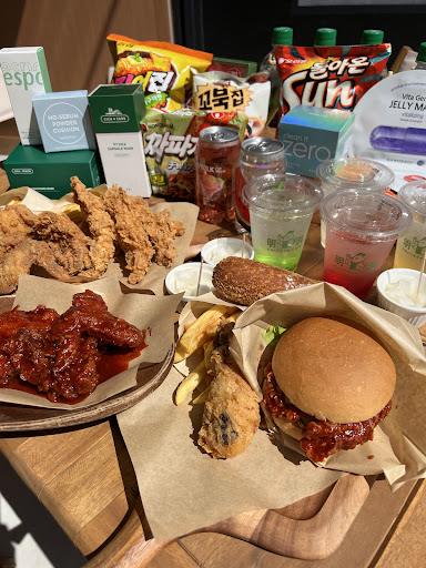 Read moreイートインと、テイクアウトのできる店内広めの韓国マートのお店です。中で韓国の物品が売ってます。化粧品は、メーカー種類が少しあり。お菓子と、冷凍物と、インスタントラーメンとか。沢山の品数は有りませんが店内広めなのと、私が行った時には、お客様よりも店員さんの方が多めでした。駅近ですが、店舗の前には駐車場が無いため行く機会が無く季節の良い春に行きました。近くのコインパーキング使用。¥200くらいでした。さっと見てちゃっちゃっと帰るって感じにして駐車場利用。お食事の値段は物価高な昨今にも関わらずどれも安いとおもいます。味とか、盛り付け等普通な感じ。スムージーみたいなの飲みました。普通の値段です。飲み物の上に生クリームみたいなホイップが安価なタイプ?かな?口に残って全体の味を悪くさせていて安かったけど残念かな。650円くらいです。氷の粒々が、大きいので、スムージーな感じがしませんね。チェーン店っぽいお店なので、期待してましたが、ちょっと期待外れでした。バーガーも、パンが美味しくなくて明洞チキンと書いてあったので、期待してたのですが、なんか全体的に食べ物は、おすすめ出来ないんだなぁーと思いました。マートと書いてありましたが、種類も、少なくて普通にア⚫︎タとかの化粧品コーナーの方が韓国品は多めなのでわざわざここで買う?とちょっと化粧品に関しては思いました。インスタントラーメンは、種類が沢山なのでラーメン好きには嬉しいお店。テイクアウトイートインの食事のコーナー側と物品はレジがバラバラなので、買う時に声かけるようです。食べるところにカーテン透明があって、無いと良いのになぁーと。買ってる人見えちゃうし、食べ...