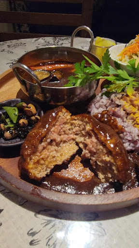 お腹空いてて料理の写真撮るのを忘れてしまいました。 金曜のお昼11時半ごろ訪問。 ドアには“開けにくく〜”の表示。口コミで知っていたけどちゃんと書いてありました。 バイトの女の子かな、ちょっと慣れてない感じでしたが、丁寧に対応しようとされていて好印象でした。 煮込みハンバーグのランチプレートと季節のパフェを注文。 料理はとても美味しいです。 コーンスープ、タケノコ水煮のマヨおかか和え、とても気に入りました。美味しいですね。 サラダも、パスタの付け合わせやこんにゃくの炒め煮でしょうか、そちらもよし。 肝心の煮込ハンバーグ、ふんわりしていてこちらも美味しい。煮込みソースは、ウスターソースが多めに使われているんでしょうか、そちらの酸味甘みが強く私好み。ご飯は雑穀米でした。 量もちょうどよく、ご飯はおそらく150gかな。 プレート上にはメイン、サラダ以外に種類も多くあって飽きません。文句なしです。 サラダの内容も色々ありました。書ききれません。