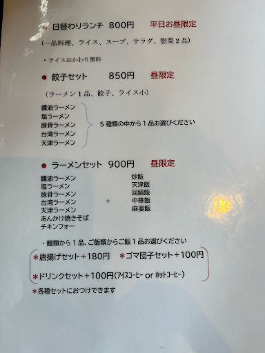 近所なのでよく利用します。 ランチタイムのラーメンセット(麺類と御飯物を5種類の中からチョイス)は土日祝も注文でき大変お得。 あと、注文してからすぐに出てくるのもありがたいです。 混雑時でも5分と待たずに提供されます。 台湾ラーメンは全然辛くないので物足りないです。 但し、激辛台湾ラーメンはマジで危険です。 翌日トイレと友達になるでしょう。 中華飯は結構量が多いのでお腹いっぱいにしたいときはおすすめです。