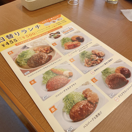 Read more日替わりランチ ハンバーグ&唐揚げ ドリンクバー スープバー付き スープはクリーミーポタージュ、コーンポタージュ、オニオンコンソメの3種類から、 今回のクリーミーポタージュは何かインスタントッぽい味がするけど?、気のせいか? ハンバーグの大きさは充分、ソースがテリヤキ系は珍しい、ソースは何種類かあって選べたらもっと嬉しいが‥‥ 唐揚げの味付けはチョット薄く感じたが、味は普通だと思います?が、大きさは、大きめでランチとしては満足出来る このお店は全てベルで呼び注文 商品もスタッフさんが運んで来る お会計も有人レジ 今では珍しいかもしれないが、個人的には好きなシステムです 氷もキューブでなく、厚みが薄いので口に含みやすいくいい 感じのいいスタッフさんだから尚更、安心して時間を過ごす事が出来たが‥‥ 居心地がいいので、又
