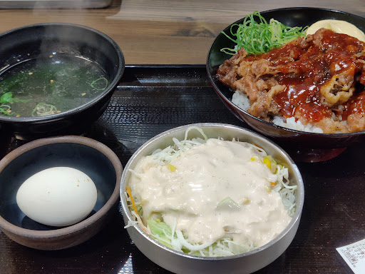 券売機で発券し、窓口に提出、隣で調理して、ブザーが鳴れば取りに行く。 イオン等のフードコートに入っている、券売機を使用する飲食店、のイメージが近いかもしれません。価格も決して安価ではなく、フードコートの価格帯に近いです。 テーブルの清掃はされず、テーブルに半券が落ちています。 提供口のすぐ隣で調理をしているため、店内は焼肉店のような臭いで充満しています。おそらく臭いを消すためでしょうが、エアコンの給気口が提供口の真上にあり、逆に臭いを吸い上げてテーブルに向けて空気を送っています。 一人用のカウンターテーブル全席に風が来るようになっているため寒いし臭いです。 丼もフードコートで使用されているような、比較的平らな物を使用しています。箸も滑り止めの付いていない、学校給食で使用しているようなつるつるしたプラスチックの角箸です。