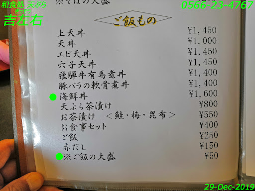 天婦羅が食べたくなった時、自宅で一人分だけ作るのは大変、そんなときは外食に頼るのが一番、そこで今回お世話になったのがこちらの吉左右、初めての来店です、お店に入ると待つことなくこちらに気づき丁寧に案内してくれました、お品書きを眺めていると緑茶とおしぼりを出してくださり、お決まりになりましたらお声を掛けてくださいと急かされることなく自然な感じが良かった、店内のBGMは音量小さめのJAZZが流れていたような、注文したいものが決まり女将さんを呼ぶとき僕は「すいませーん」ではなくて「はーい」とラフに主張、居酒屋みたいにガヤガヤしていないので声を張らずともすぐに気づいてくれます、おススメはと尋ねて3つほど候補を出していただいた中の一つ松花堂をオーダーすることに、待っている間お品書きを眺めていると「お待たせしましたー」と運んできてくれました、体感的には10分は待たされていません、平日の18時でお客もまばらということもあると思いますが良いタイムです。とその時にも足し茶もしてくれました、二段重ねの箱を開けると綺麗に盛り付けられたお料理が、シャッター音を聞かれるのがイヤなので写真は撮らないつもりでいましたが、盛り付けが見事だったので映してしまいました、箱を置いた位置が悪かったのかバランスが若干悪く感じるのは撮り手のセンスの問題なのでそこのところはご容赦ください、写真を見ていただくと解るとおり煮物、酢の物、天婦羅、刺身と色とりどりで味も美味しく視覚からも楽しめます。さらに個人的に好きだったのが刺身の上に菊の花びらだったり、前菜の下に敷かれた南天?でしょうか?無くても提供できるところに一手間掛けるこだわりが感じられます。仕事帰りに落ち着いた店内でスマホを触らず空間と食を楽しみながら時間...