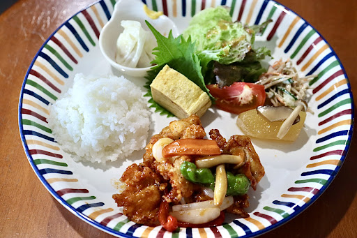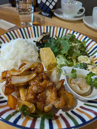 ◆本日のプレートランチ(1,500円) ・酢鶏、手包み焼売、だし巻き玉子 ・ごぼうサラダ、冬瓜の煮物、ごはん ・みそ汁、無農薬屋久島ウーロン茶 ◆ポンジィチーズケーキ(600円) (ランチを注文すると100円引き)