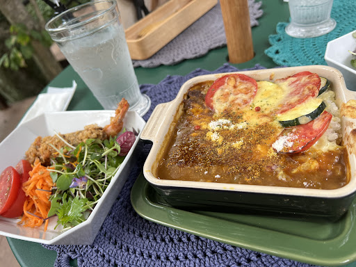 Read moreEra aperto durante il Showa Day, abbiamo trovato una atmosfera molto piacevole immersi nel verde sulla terrazza, da cui si sente il rumore di un ruscello lì vicino. Interno affollato di oggetti interessanti. C'è spazio per chi ha cani. Cibo ottimo, sapore autentico, presentazione di ogni portata molto curata. Quantità generosa rispetto alla media dei ristoranti giapponesi ma non pesante. Sì finisce il piatto soddisfatti di aver assaporato un pasto gustoso e anche di bell'aspetto. Carini i fiorellini (si possono mangiare) che adornano le portate. Ho ordinato il menù set curry di carne + insalata (non noiosa). Si può scegliere la quantità di riso (porzione piccola, media o grande). Ho pagato 1800¥ (che è il più economico), bevande escluse. È stata una piacevole sosta sulla strada tra la stazione e il museo...