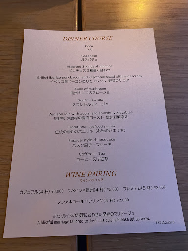 Read moreA trip to the closest vacation from Tokyo, Karuizawa. We had a nice sit down at a modern Spanish place which has been on my list for a while. The Jamon Iberico Coca was to my liking, and the crunchiness was appealing. The salty level was enough to get things started. Gazpacho with coconut cream was quite nice, the cream really gave the refreshing touch that regular full fat cream doesn’t. Will try using coconut cream for other items than Thai curry. The pinchos which followed was nothing extraordinary. It was nice follow up appetiser to the meal but was regular. White shrimp fried on the side was my favourite but other ones I felt were just seasonal factors. Overall nice start to the meal and it felt cozy enough to have a conversation at a leisurely pace. ①Iberico Bacon and Watercress Salad→personally not a huge fan of thick bacon but it was nice to have the saltiness adding an extra flavor to the light salad dressing. It was a refreshing pit stop on the course ②Mushroom Ajillo: a nice touch to the usual shrimp one. There was enough umami from the mushroom to give a good dip for the side of baguette. They do make alternatives ③Deer Roast: surprisingly not as gamey as I thought. It was a good flavor with the sauce on the side to let you enjoy the lean meat ④Seafood Paella→was a bit “what?” when the fried shrimp was on top giving me a double take. Nothing special but it was a nice presentation. Although I enjoyed the crispiness taste wise pretty regular. The paella was a bit more Japanese then I liked. Having enjoyed some awesome ones in Spain…my expectations were a bit too high. It was nice and light with the dashi flavouring but not Spanish enough for my taste ⑤Bask Cheesecake: a nice light touch to end the meal. It wasn’t over powering or too sweet. Perfect size for an overly full feeling. It wasn’t as heavy so it lets you end the meal on a lighter note I would try coming again as it was a nice ambience and service wise not bad. It’ll probably be one of those slow sit down dinners you enjoy with the people you have a long conversation with . . . . .