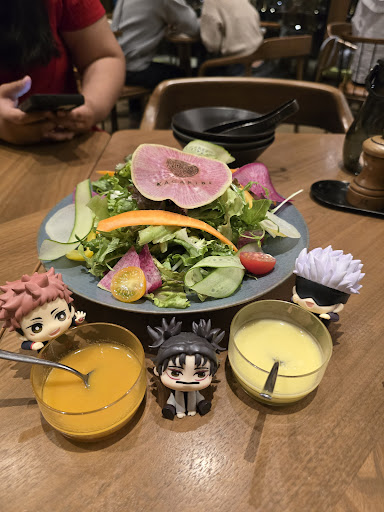 For a brand name hotel, it’s pretty much more or less what you’d expect. The 4 course lunch set is a decent price for what you get : a soup (plus bread), pasta, main and dessert plus a drink. It’s not as affordable as some other options around the area, however, the service and atmosphere of the hotel area is very elegant and beautifully decorated. The food portions are on the smaller side, the soup was shockingly shallow in the plate, the pasta was decent, the mains were ok: the zuppa de peace was mid, the chicken was the best, and the beef was good quality but a bit under salted in my opinion. The dessert was awful though - the cacao sans farine was topped with yuzu cream and a mixture of nuts covered in chocolate and caramel ice cream, but the nuts baked into the chocolate cake was spicy? I had to pick off the nuts to finish it, but the flavor combination was experimental and frankly terrible. I wish there was a choice to pick something else, or at least a warning that it would be spicy. Generally, everything was fine (especially at the price you’re paying) but the dessert is an absolute let down and should be taken...