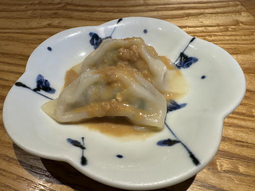 以前も食べて気に入った「ごまだれ水餃子(2ケ400円)」も前菜として注文。 まずはこれが出てきて食べるがごまだれのほんのりした甘さも餃子に合うから嬉しい。