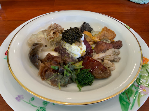 🟩お任せコース (33,000円 税込) ・鹿肉 クロカワダケ、アンズダケ、アミダケ、平茸、霜降りしめじ、ミズムカゴ(ミズの実)などの盛り合わせ。