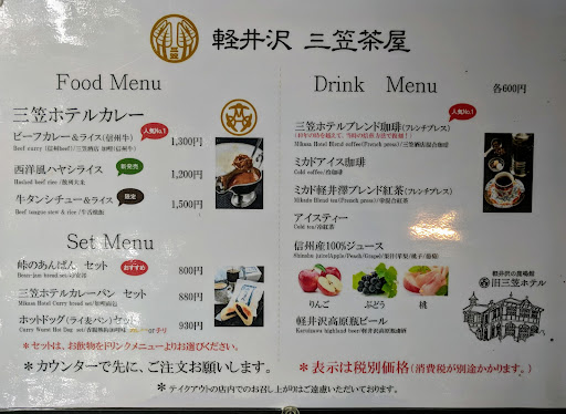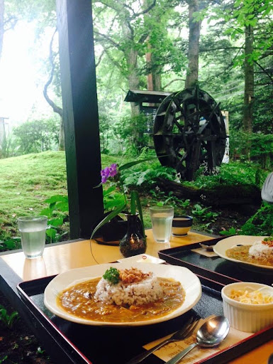 I went there twice, once just for coffee, and once for lunch. I was pleased both visits. The location on Mikasa Dori near the previous hotel (now a museum) is good if you've walked from Kyu Karuizawa Ginza Dori (about 30 minutes). You can take a break before walking back. The tables outside are next to a river, and the view is very nice, a forest. The coffee is served elegantly in a beautiful China cup and saucer in a French press, accompanied by an hourglass timer, flowers and snack. The curry is the same recipe as was served in the Mikasa Hotel. There are numerous interesting curios in the store on display...