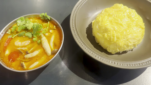 続いて相方の「ラープムーライス」が運ばれてきた。取り分け用に『アルミ小皿』を用意してもらいシェア。 …タイ風の豚ひき肉とハーブが乗り、下にはタイ米。酸っぱく甘い複雑な味が面白い。