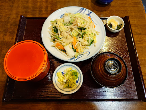 Read more中途半端な時間になってしまったので、通し営業のお店を探してみたところ、こちらがあったのでお伺いしてみました。最近減量を始めたので、カロリー少なめな定食を探していたところ野菜炒め定食があったので、それをキープしつつ、名物もつ煮という文字が目に入ってしまったので、ほぼほぼ迷わずに一緒にオーダーさせてもらいました。野菜炒めは家庭で出てくるホッコリな味付けで、しかも塩分控えめ感じもしましたね。ホッコリが良きです。もつ煮はもつのプルプル感も良いですが、ジャガイモを一緒に煮てるので、汁にとろみがあり、そこが美味でしたね。味の染みたジャガイモのかけらともつを同時に頂くと非常に美味です。他にも気になるメニューがあったので、また近くに来た時にお伺いしてみたいと思...