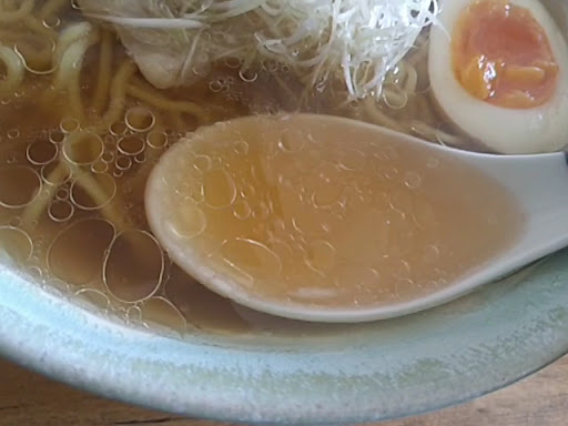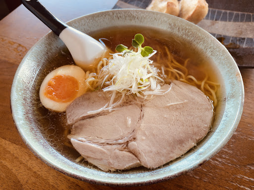ラーメン+餃子1500円 日立の桃苑の店主の娘さんのお店みたいですね。 笠間市総合公園前にある、小洒落たたたずまいで、パット見、ラーメン屋には見えないですねw 開店時間丁度に着きましたが、駐車場ギリ1台空き。店内もラーメン屋らしかなぬスタイリッシュな感じで、向かいの公園の眺めもよく、ラーメンカフェか? メニューは醤油味のラーメンと餃子。 先に運ばれてきた餃子は、ホワイト餃子みたいな揚げ焼きタイプ。かなりこんがりとしたきつね色で、桃苑のとは明らかに違う感じ。とりあえず熱そうなのでラーメン待ち。ラーメンは中華屋的な清湯に、煮干しを加えて中華そばに寄せた感じかな。塩気がギリギリの低さで、スープ飲みたい自分には嬉しい感じ。合わせる麺もよくある中華麺だが、茹で加減よくすすり心地よし。特筆すべきは肩ロースチャーシューかな。存在感抜群で、1枚でも十分な感じ。 そろそろ冷めた餃子をパクリ。 ああ、桃苑の餃子のあの皮の厚さと、野菜がパンパンに詰まった感じはそのままですが、揚げ焼きによる皮の感じがかなり違いますね。フランスパンのバケットwあれ 半端ない食べごたえなので、2個ぐらいでちょうどよいかもw お会計時、『餃子残ってません?』と聞かれましたが。全部いただきました。ごちそうさまでした🤣 接客もとても丁寧で、居心地の良いし、売りたいものが明確でよいビジネスモデル。いつも混んでるのがそれを表してるように思う。 桃苑とは違う、この店の色がよく出てて良い店ですね。次...