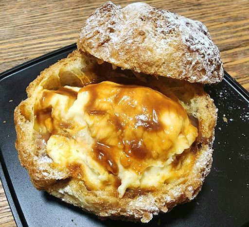 キャラメルシュークリームは、ほろ苦さがある大人向けのシュークリームで、甘味よりも風味を楽しむ感じです❗
