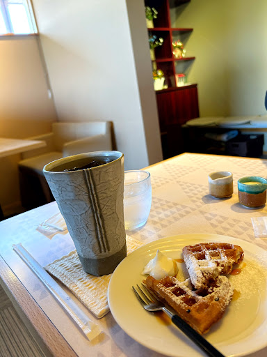 コーヒーに無料でついてくるワッフルも美味しかった。 ただ、母が別に頼んだチョコバナナデニッシュは思ったよりも生地が硬めでしっとり感が少なかったように思います。