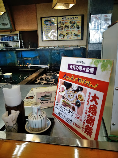 Read moreランチで利用しました。 イカが有名のようで、店の中心に生簀があり、生きたイカが泳いでいて、造りなど注文を受けると、そこから網で掬ってさばいていて、新鮮な演出をしています。(ほんとうは釣ったあと、即〆たほうが新鮮なんですけどね) ランチが刺身付きが税抜1,100円、刺身抜きが税抜900円となっており、今回は刺身付で頼みました。 しかし、刺身がイマイチでしたね。肝心のイカですがコウイカなのか、ゴツゴツ硬く、甘みも少なく全然美味しくなかったですし、マグロも不味かったです。 天ぷらのイカは美味しかったですね。刺身は要らない方を頼んだ方が良さそうです。 普段、宴会や法要などに利用されるためか駐車場が広くて良いのと、新コロナ対策で店に入る全員にアルコール消毒を店員が徹底させているところは、配慮されて...