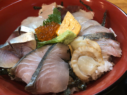 4回目の訪問。 笠岡に行くと立ち寄るようなりました。 本日も海鮮丼を注文したのですが、付け合わせのおひたしに旬の筍が使われていたのが嬉しかったです。 行くたびに来客が増え、外で待つことも急に増えました。急増すると忙しくなり、接客の低下や料理の効率化に向かうことを東京でしばしば目にしていたため、家族経営ならではのこれまでと変わらない空間を期待しています。 そういえば、前回同席した方が日替わりを注文したけどメニューが外にしかなく、わざわざ外に確認しに行くというところは、店内でも目視できるようブラッシュアップして欲しいところかな?アラ汁も美味しかったです。 あとは海鮮丼と酢飯が合うといつも思うのは、食文化のちがいなのかな? 本日、2回目の訪問。 12時過ぎに行くと5組くらいの先客があり、後からも予約の電話や訪問客がある。 みた感じ、遠方からではなくご近所に愛されるお店なのであろう。近所にそういうお気に入りのお店があったら自分は決して公にせずコソコソ通う。イチゲンに荒らされたくないという身勝手だが、そういう落ち着く空間にしたいお店であるが、ここは自分が遠方者であり末長く営業して欲しいので投稿。 ご飯は酢めし派ではあるが今日も酢めしではない海鮮丼を注文。今日気付いたのだが、中国地方の海苔は味付け海苔が主流でコンビニのおにぎりまで味付け海苔で驚いたが、ここは普通の海苔だった。軍艦も味付け海苔ではないのだろうと想像すると少しホッとした。 今日は前と少し切り身が違った。鰆と鯖、前はなかったような。でも両方好物なので有り難い。小鉢は豆腐なのに胡麻だれのような甘さと少しビネガーのような酸味がうまく調和されている。そして蓮根とこんにゃくの煮物が付いていた。汁物もアラでしっかり出汁が取られているものだったが、少し煮詰まってるようにも感じた。あとほうじ茶はこれは個人的な好みだが熱々が好きであるが、色々な客がくるとこのくらいよ湯加減が無難なのだろう。 今日は夜のメニューを見ながら待っていたが、夜のメニューも凄く興味深く行きたいが、絶対呑みたくなるので車でしか行けない自分にはお昼が丁度良い。海鮮丼ばかりでなく、次はランチのお寿司を食べてみたい。 2回目てもまだ色褪せることなく、満足いく海鮮丼を提供いただき感謝です。