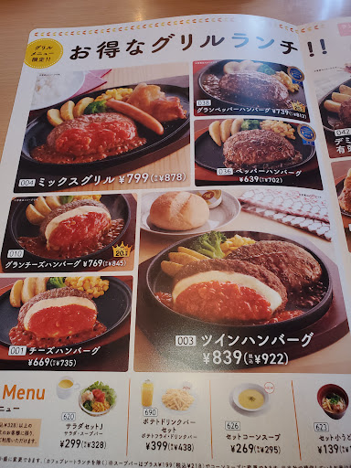 Read more黄色い看板が目印のファミリーレストランです。 店内は、テーブル席。 無料Wi‐fi有。 ***** お料理 ***** ■グランペッパーランチセットをいただきました。 ランチタイム(10:00~15:00)の注文でライスまたはパン無料でした。 通常ハンバーグから20%増量とのこと。 さらに値下げしたとのこと。 大ききめのハンバーグ。 付け合わせは、ポテト、ブロッコリー、コーン。 ふっくらジューシーなハンバーグ。 ランチタイムはライスまたはパンが無料で付いていました。 ライスでお願いしました。 御馳走様でした。