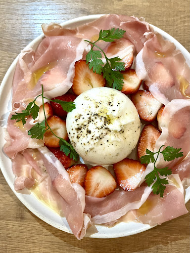 お通し ブッラータと古都華のカプレーゼ 前菜盛り合わせ(3人前) 牡蠣のスモーク 極太アスパラのビスマルク 大和ポークのロースト 生ウニとカラスミのミリオタリーニ
