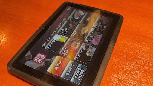 オーダーはタブレットで行い 肉や料理、飲物などは 特急で席まで運ばれて来ます。 回転寿司の特急レーンの様な仕組みです。