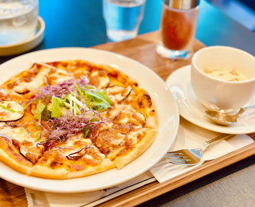 Read more茄子とベーコンのピッツァと枝豆の冷製スープのランチセットを注文しました。1600円。 キャッシュオンデリバリー方式なのがちょっと意外でした…。 レジで番号札を渡されて好きなテーブルに着席するシステムです。