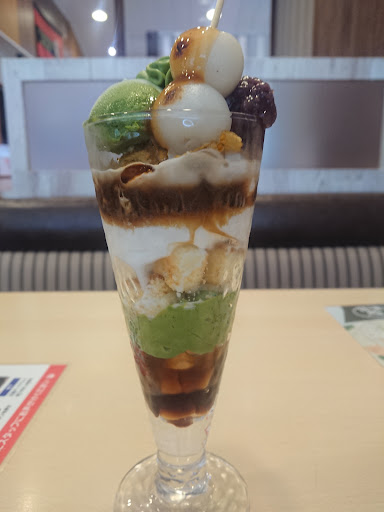 メニューはハンバーグやチキンが多く、ファミレスの典型のように思いました。 好みの問題ですがさっぱりしたメニューが少なく思いました。 デザートは種類が多く、この時期はブドウのパフェが美味しそうでした。