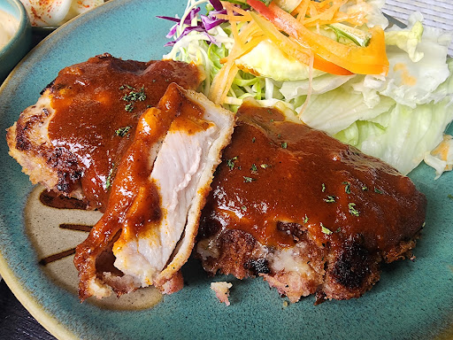 平日の12時前に、会社の関係者と伺わせていただきました。店内は、外観と異なり南国的な雰囲気でした。 私は、ポークカツレツチーズ焼きを定食セット。他の方は、ポークヒレプロシェットを定食、鳥肉の照焼定食を注文しました。