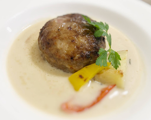 看板メニューの自家挽きハンバーグはブロック肉を部位ごとに違う挽き具合でミックスしたというこだわりだそうです。ソースは白いトマトのクリームソースか、濃厚デミグラスソースの2種から選べます。