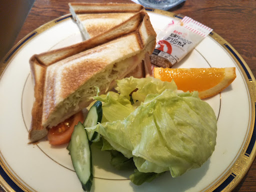 先にアイスコーヒー、7分程ホットサンドが配膳されました。 アイスコーヒーはビターでとっても美味しかったです!最近はコンビニのアイスコーヒーもかなり美味しいですが、当たり前と言ったらそうかもしれませんがさすが喫茶店のアイスコーヒーという感じでした。 ホットサンドは昔ながらの喫茶店のホットサンドという感じで、シンプルですが美味しいホットサンドでした。 ホットサンドには他にトマト、きゅうり、レタス、オレンジが付いていました。 明るくゆったりできる店内で軽食するにはちょ...