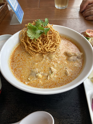“Khao Soi” is curry ramen, a famous noodle dish that is popular mainly in northern Thailand, such as Chiang Mai. It is a rich soup made from spicy curry and coconut milk. There are soft ramen noodle and fried ramen noodle in the bowl.