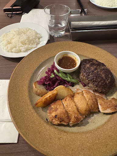 Tasty japanese hamburger steaks! They have a base set meal where you can choose which vegetables you want, and then there are a lot of “upgrades” you can choose like having larger portion sizes. I had chicken and hamburger which were both well cooked.