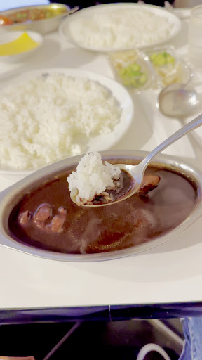 味は少し苦味が効いてコクがあり美味しい。新宿のあの洋食屋さん、上野のあのカレー屋さんのカレーより美味い! ビーフカレーは大きめの牛肉の塊が3つ、大きめにカットしたジャガイモが1つ入ってます! しかも、カレーのルーが予想よりも多いので、ライスを追加するか生まれて初めて迷いました。ライスは固めですが、そのうちに気にならなくなります。もう2口目で満足してきました。