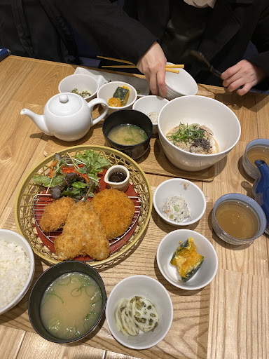 料理に関してはお店の外のショーウィンドウに食品サンプルが並べられているため、どんな料理が出てくるか大体想像がつくかもしれませんが、それの3回りくらいしょぼいものが出てくると思って下さい。 豚しゃぶの何とかってのを頼みましたが、サンプルはある程度形がしっかりとした肉なのに対して、パサパサのこま切れのようなものがサンプルの2/3くらいの量で提供され、カニクリームコロッケは一口サイズのものが2つ(これはサンプル通り)、あとはご飯と惣菜3種と味噌汁といった形です。