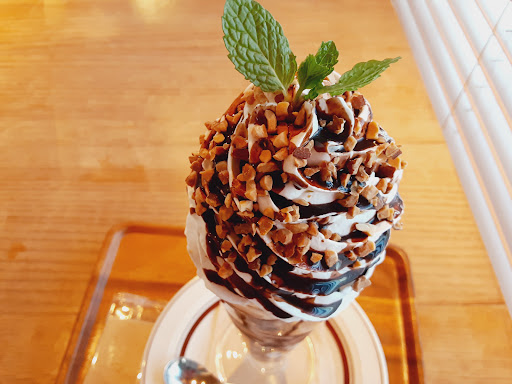しばらくするとデザートが運ばれてきました。チョコレートパフェはボリューム感がありました。香ばしいナッツとチョコレートが合っていて、クリームとアイスの他に中にチョコチップクッキーが入っていて、甘さのバランスが良くて美味しかったです。最後にお願いしたブレンドコーヒーはテラス席に移動して頂きました。香りが良くて美味しかったです。