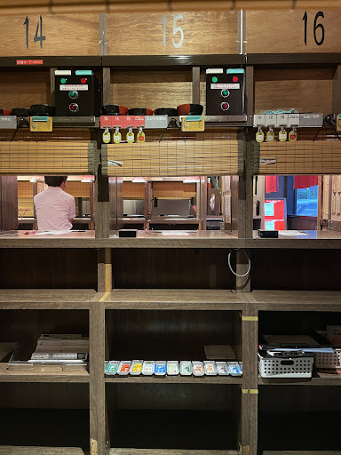 一蘭と言えば左右が板で区切られ、目の前には暖簾がおろされる「集中システム」とかいう形のカウンターが特徴的です。 まあ、集中できるっちゃあできますが、一人分のスペースは、たぶん幅60センチくらいでかなり窮屈です。 なお二人以上で利用すると、この仕切りの板はたたんで収納されるようです。