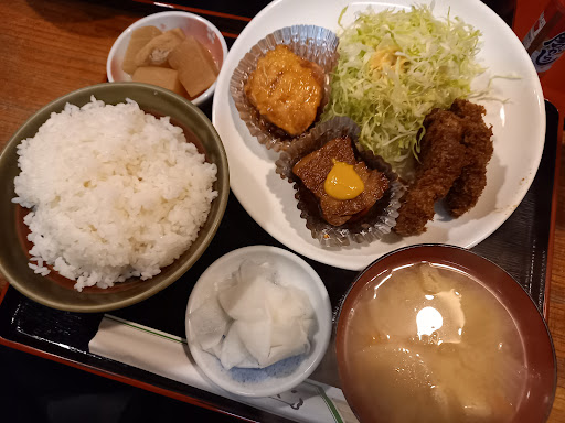 「特選定食950円」を注文し、15分程度で配膳されました。 つくば焼(鶏肉)と、ヒレカツ、田舎味(豚バラ肉の煮込み)、キャベツ、大根の漬物、大根と油揚げの煮物、具沢山の味噌汁、そしてなかなかのボリュームのご飯のラインナップです。 どのおかずも最高に美味しいです!特にヒレカツは油も軽く肉もやわらか、田舎味の豚バラも濃いめの味付けでほろほろに柔らかくすごく美味しかったです。