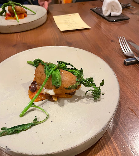 メインディッシュは、「藤原さんの安曇野放牧豚」。ストレスなく育った豚が持つ、清らかで甘い脂の旨み。その魅力を最大限に引き出すのは、日本の発酵文化の粋である「もろみのソース」。そして、驚くほど滑らかで粘りのある「きたあかり」のピューレが、すべてを優しく包み込む。大地の恵みへの感謝と、それを最高の形で届けんとする料理人の情熱が伝わる、感動的な一皿であった。