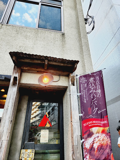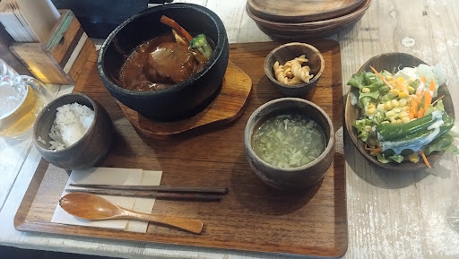 いろいろ目移りしますが、この日はトップメニューの「黒毛和牛100%の石鍋煮込みハンバーグ 1300円」を、妻は「石鍋焼きチーズキーマカレー+温玉 1000円+100円」を、それとドリンクに「ジンジャーエール、自家製紅茶 各200円...