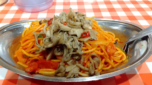 入口右手側にある食券機にて 「ナポリタン」メガ盛り(ミートソースもあります)を購入後、 期間限定のトッピング「きのことにんにく炒め」を購入
