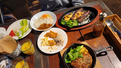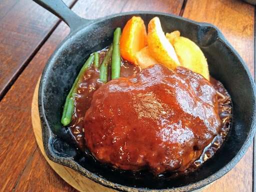 ハンバーグを注文したが、味はキャンプ場をイメージした「ちょい焦げ粗びきハンバーグ」が嫌いでなければ美味しいと感じるのではないかと。ハンバーグ専門店の上品なハンバーグとは違うので注意が必要。サラダバイキングは10種ほど並んでいて、色々なオリジナルのドレッシングがあるので楽しめる。スープとライスもお代わり自由だけど、味の濃いオニオンスープとちょっとパサパサのライスだったので...