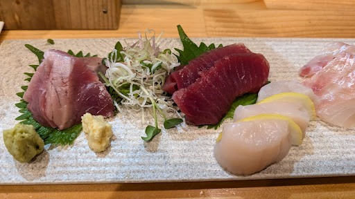 今回は、お刺身盛合せ(+うに)、アジのなめろう(骨せんべい付き)、サンマ刺し(骨せんべい付き)、いぶりがっこクリームチーズの塩昆布和え 海老真丈のさつまいもはさみ揚げと色々木の子天ぷらの盛合せ、おまかせ5貫、稲庭うどん、 美味しかった ごちそうさまです